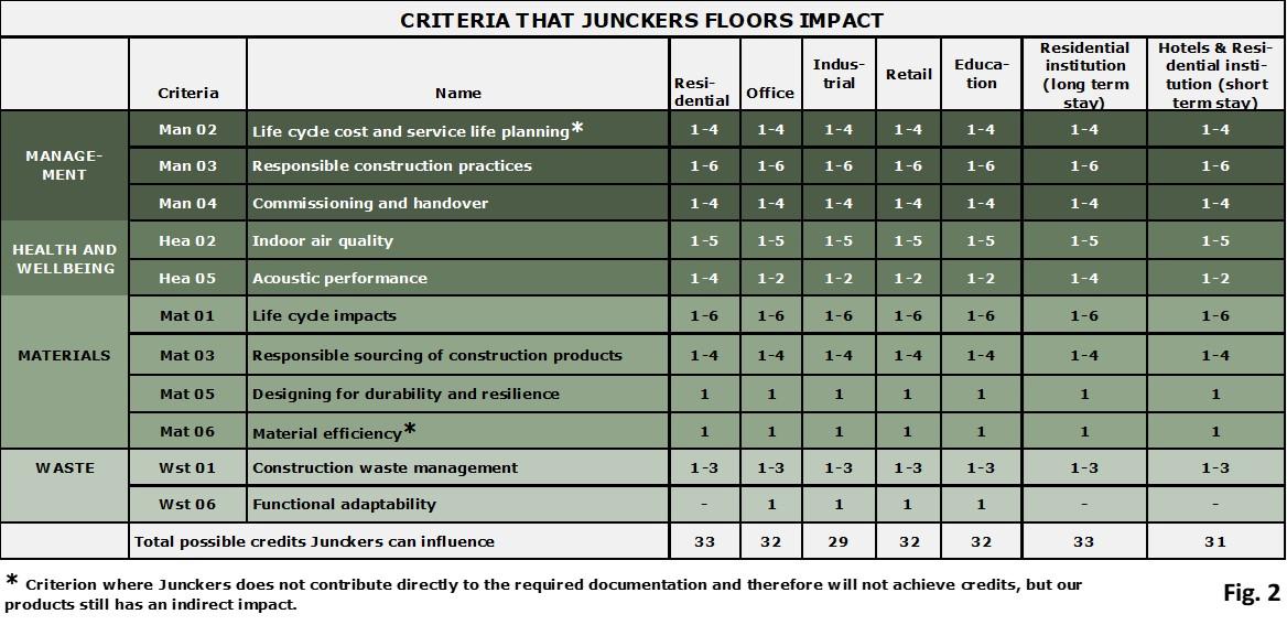 Figure 2 illustrates the eleven sub-criteria to which Junckers solid hardwood flooring can contribute directly or indirectly through our product documentation.