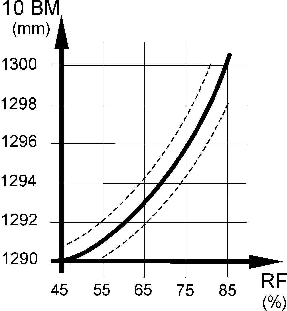 The graph in fig. 3 illustrates the 10-board rule in relation to the relative air humidity for 129 mm floorboards. E.g. an expected relative humidity of max. 65 % RH will normally require a 10- board measurement of approx. 1294 mm.