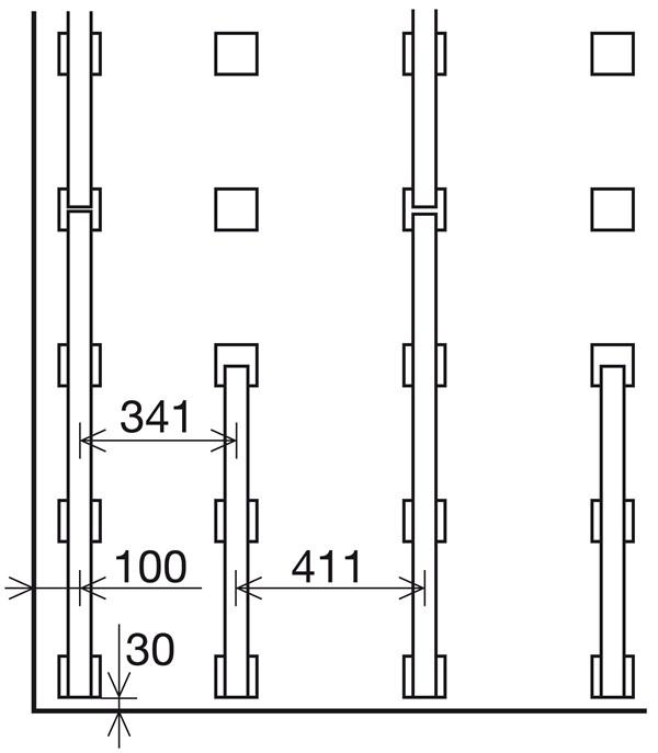 The first row of cradles is placed at 100 mm from the wall to the centre of the cradle. The second row is laid at 341 mm from the first row. All other rows are spaced at 411 mm centres apart from the last row which is again spaced at 100 mm centres from the wall.
