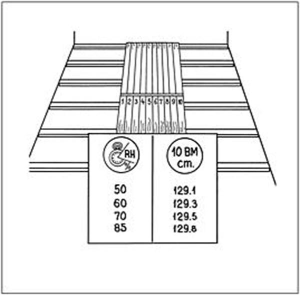 The 10-board rule is chosen on the basis of the maximum expected relative humidity of the building during the year, e.g. an expected relative humidity of max 65 % RH normally gives a 10-board measurement of approx. 1294 mm.