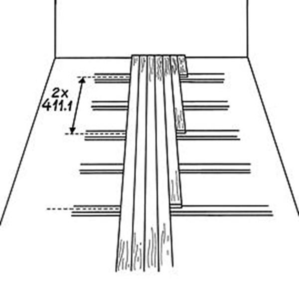 NB: with a batten distance 411.1 mm, the distance between floorboard header joints in two consecutive rows must be 2x411.1 mm = 822.2 mm, as shown in the drawing.